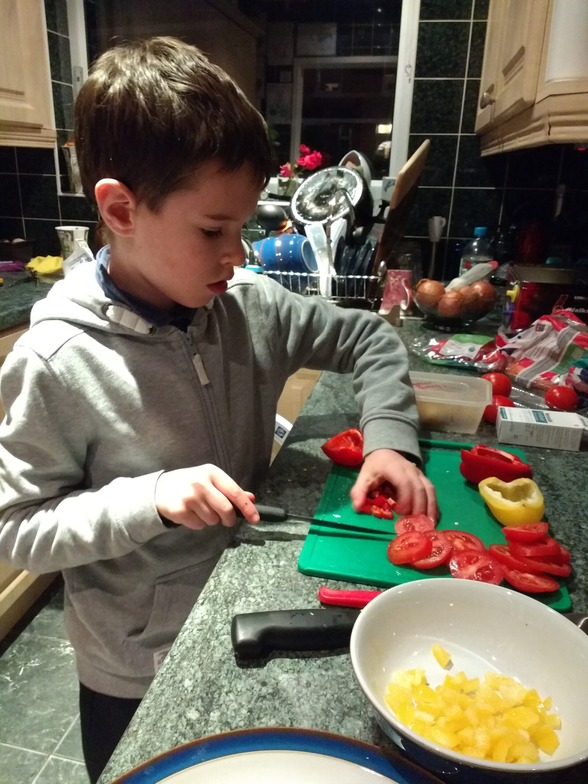 It is really important that you don’t micromanage cutting things. If the pepper pieces are not all exactly even, don’t interfere. Praise your child regardless of the uniformity of the product! If they think they can’t do it perfectly, they might not want to have a go next time. If what they are cutting needs to be a bit more uniform so the cooking time is even, help them cut the pieces into similar sizes.